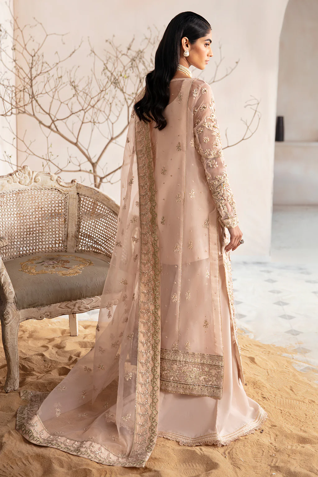Step into enchanting allure with the peachy pink ensemble – a true testament to timeless elegance. The organza shirt is heavily embellished with antique gold adda work, creating a regal work of art.