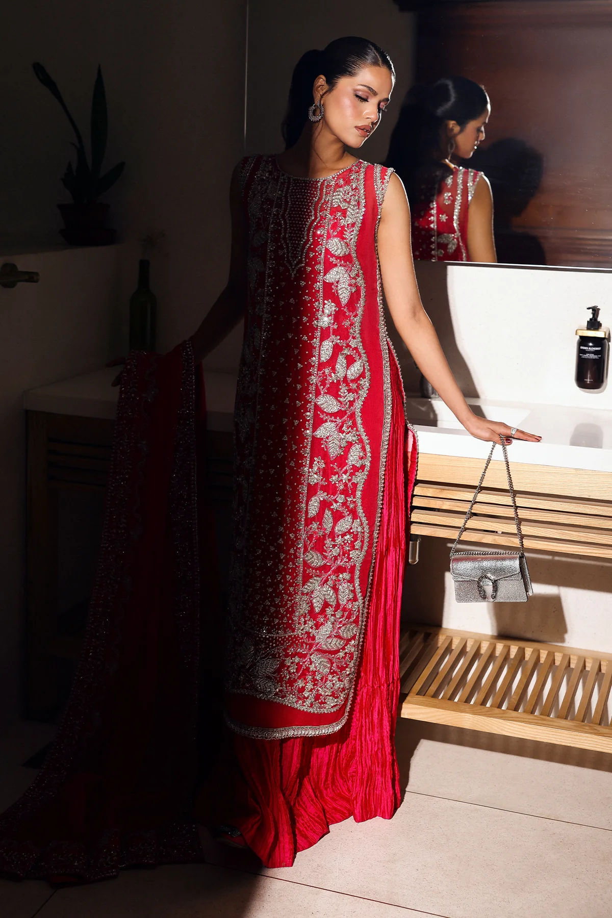 A look that turns every glance into admiration. This hot pink organza ensemble is lavishly hand-worked in silver, featuring a stunning mix of diamantes, zardozi, gotta, and intricate thread detailing for a rich, luminous finish. A crushed grip inner adds graceful texture, while the organza dupatta, framed with four-sided borders, ties the look together.