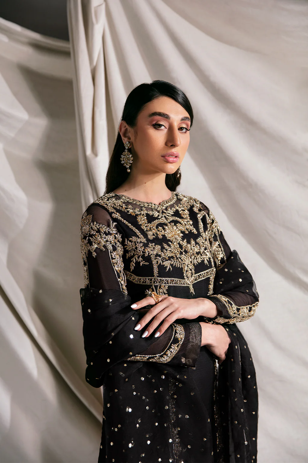 Description: Elevate your aura and captivate hearts as you don this elegant black silk shirt. Indulge in the timeless allure of a black panelled silk shirt, meticulously adorned with heavy silver and golden adda work on the shirt and sleeves, creating an intricate tapestry of opulence and refinement. Paired effortlessly with sleek silk pants, this ensemble strikes the perfect balance between contemporary elegance and timeless charm. The organza dupatta with a captivating sequin spray adds a touch of celestial beauty to the overall look.