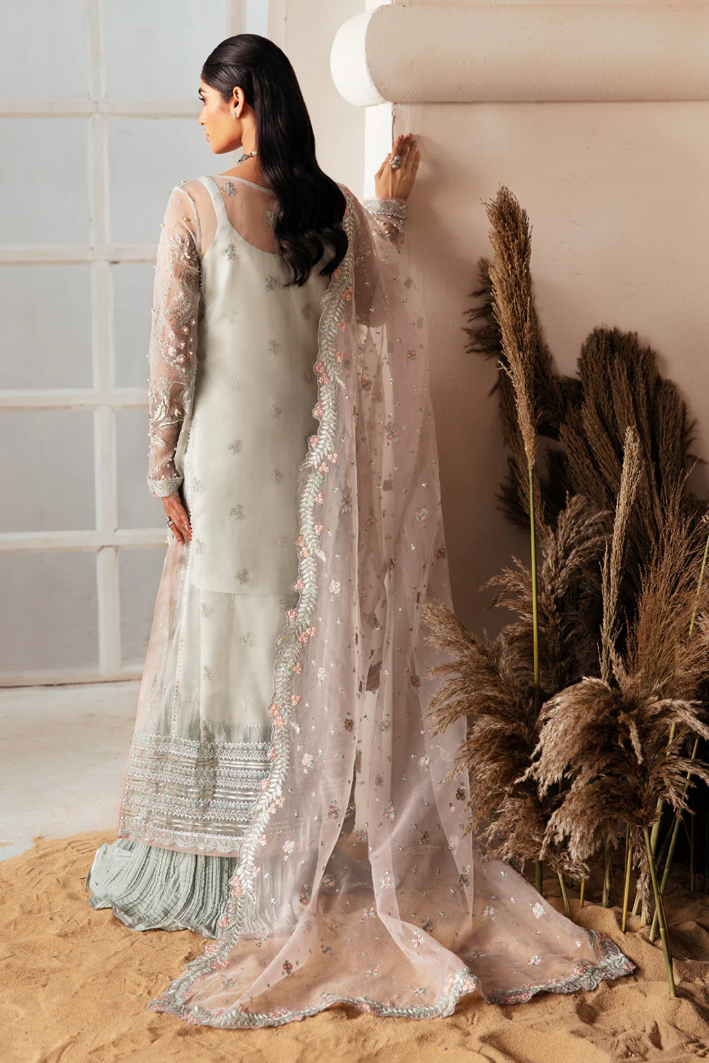 The stunning jacket comes with raw silk crushed sharara pants finished with gotta lace detailing and pastel pink organza dupatta that has embroidered borders and motif spray that enchants with every drape.