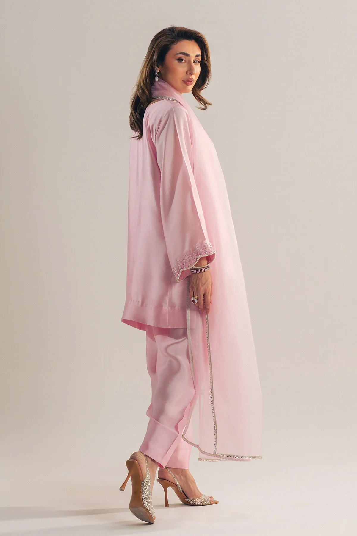 This ensemble features a beautifully tailored short shirt paired with a classic narrow shalwar. The shirt is adorned with intricate embroidery and further elevated with refined adda work, adding depth and artisanal charm. Completed with an ethereal organza dupatta finished with delicate lace, this look embodies timeless femininity and effortless sophistication.