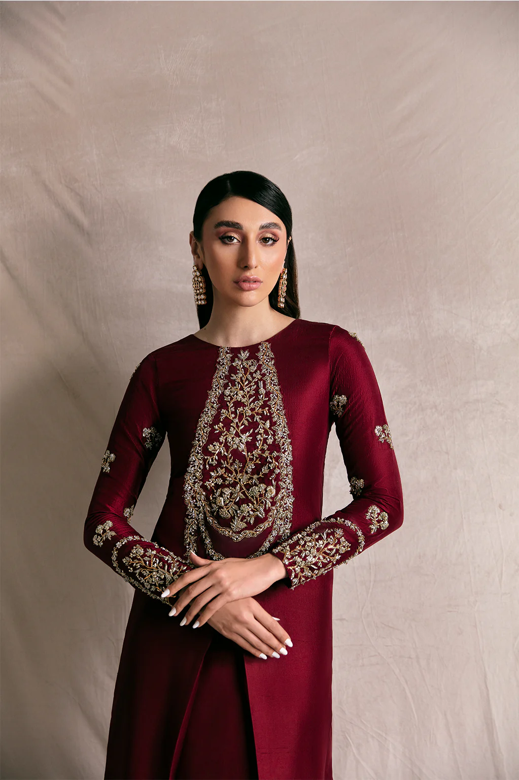Description: Amp up your wardrobe with our showstopper deep maroon ensemble to captivate hearts! This stunning satin-silk long shirt with box pleat is embellished with intricate golden handwork along the neckline and sleeves, creating a mesmerising effect that catches the eye from every angle. Paired impeccably with straight pants made of satin-silk fabric and an organza dupatta sprayed with silver sequins on borders, concluding the look marvellously.